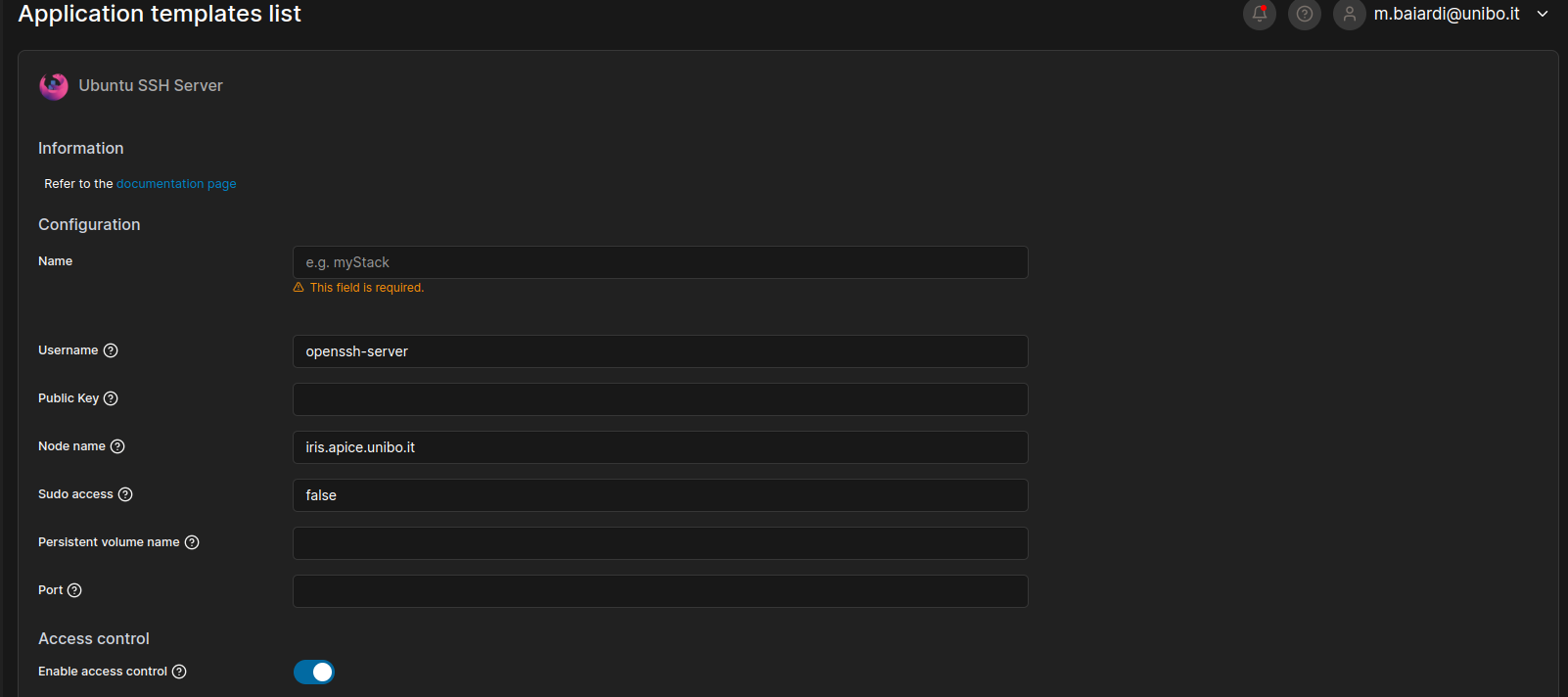 ssh-keygenon unix-based systems. - The hostname of the server on which the container will be deployed, choose one among the available ones in the cluster.