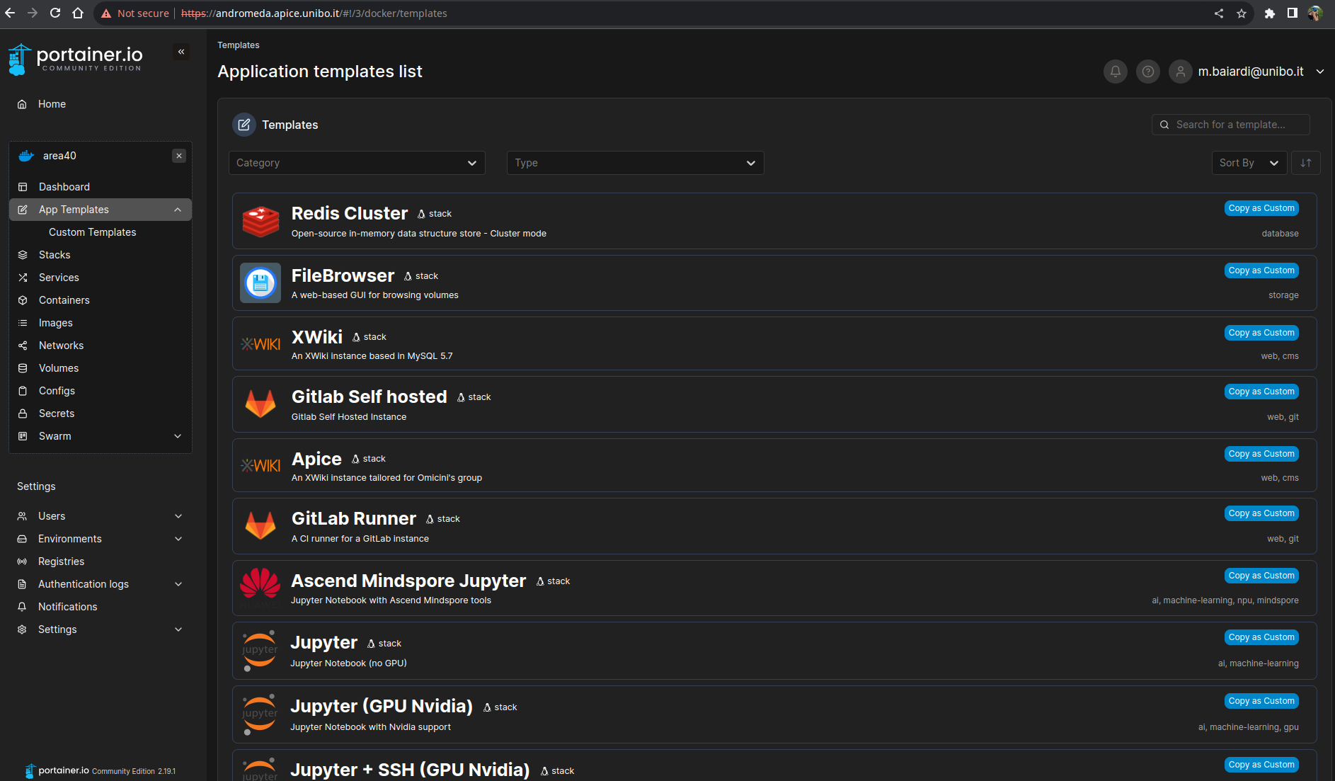 To ease the deployment of applications, several pre-configured Docker stacks are available inside of the Portainer dashboard. These templates are available in the App Templates menu entry, they are prepared to cover the most common use cases for data-scientist with the minimum configuration required.