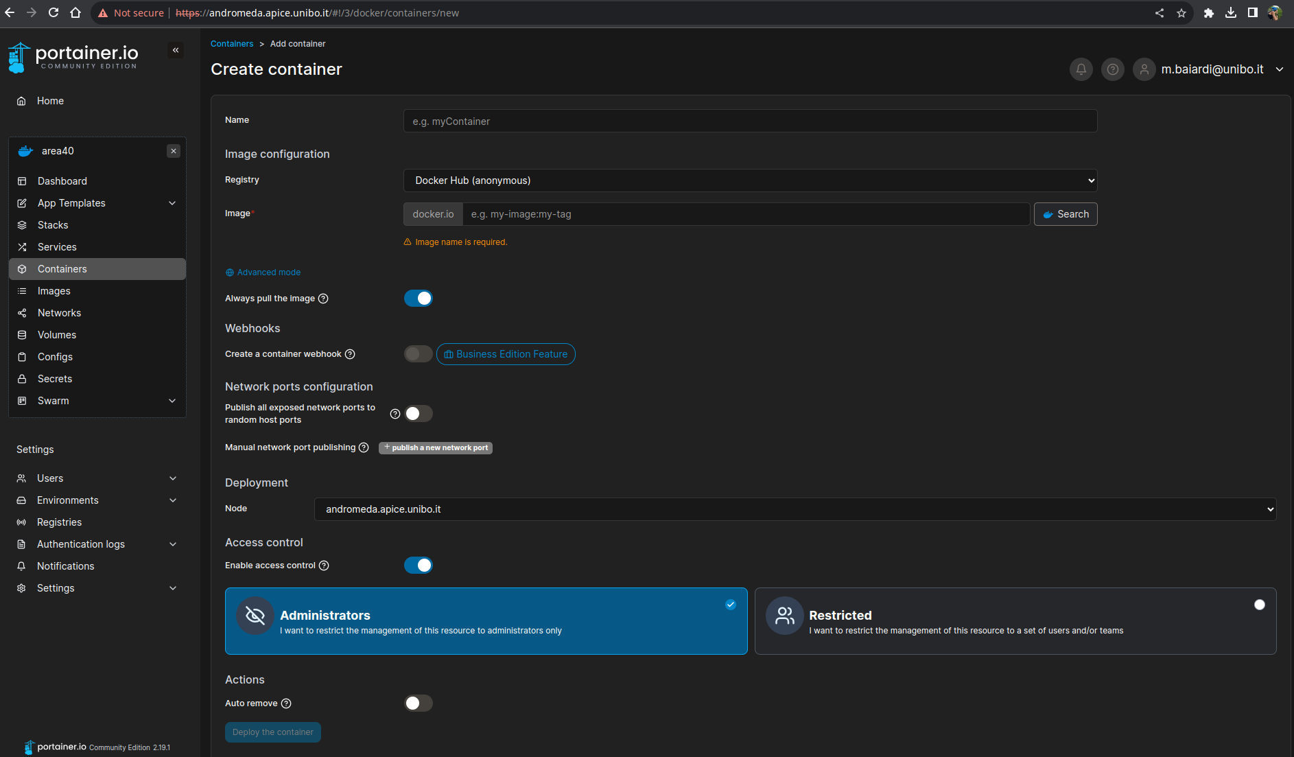 After filling out the form, the user can click on the Deploy the container button to deploy the container.